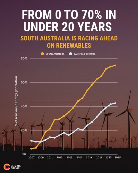 Illustration : via Climate Council : " développement des renouvelables en Australie de 0 à 70% en 20 ans, le Sud de l'Australie fait la course en tête sur les renouvelables."