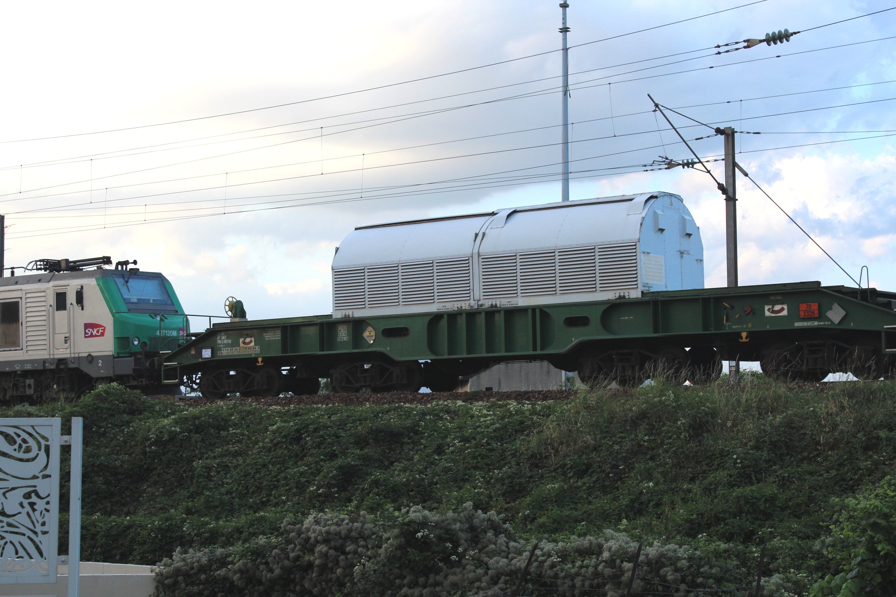 Nous avons remarqué que jusqu'à cette dernière date l'ensemble des convois observés, étaient des assemblages dédiés uniquement au transport des wagons CASTORs, attelés directement derrière la motrice, exposant les conducteurs au plus près de la source radioactive. Le 21 Aout nous avons de nouveau observé un convoi avec des CASTOR directement attelés derrière la motrice.