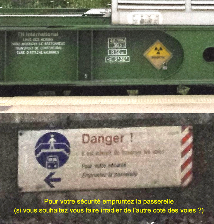 la notion de danger est toute relative à la SNCF, car un panneau rappelle qu'il est interdit de traverser les voies et recommande l'usage de la passerelle, mais la dose reçue sera la même d'un coté comme de l'autre...